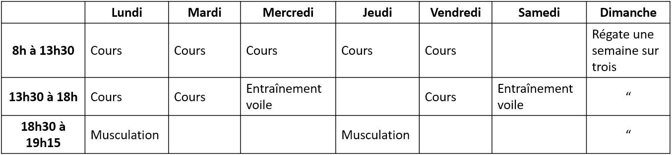 N’hésite pas à y écrire ton emploie du temps. Tu pourras y mettre tes entraînements de voile, tes séances de musculation,tes heures de cours/travail, et tes autres sports si tu en as! Pour te donner une petite idée, voici à quoi ressemble mon emploie du temps.
